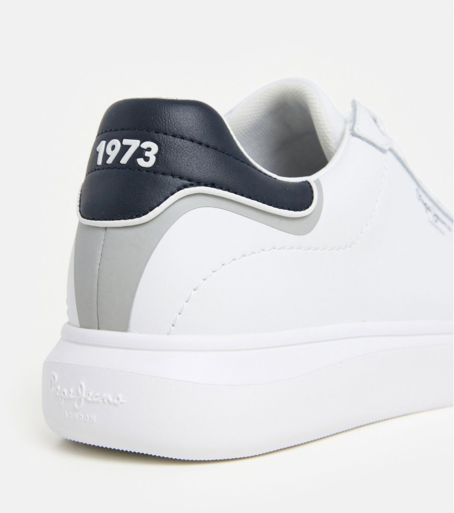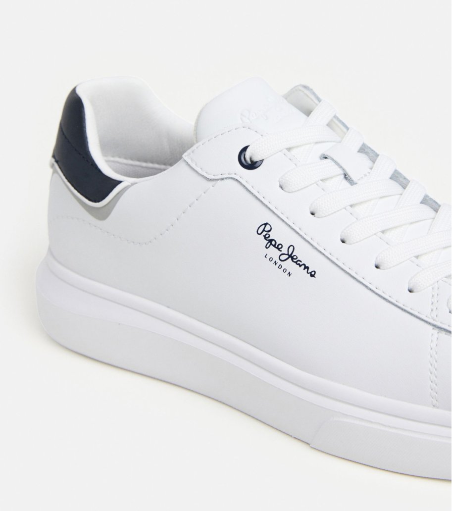 Sapatilhas casuais masculinas PEPE JEANS com cordão e especificações especiais de conforto. Uma sapatilha fashion num tom branco básico com exterior de couro liso e detalhes escuros no calcanhar, ideal para todas as horas do dia.