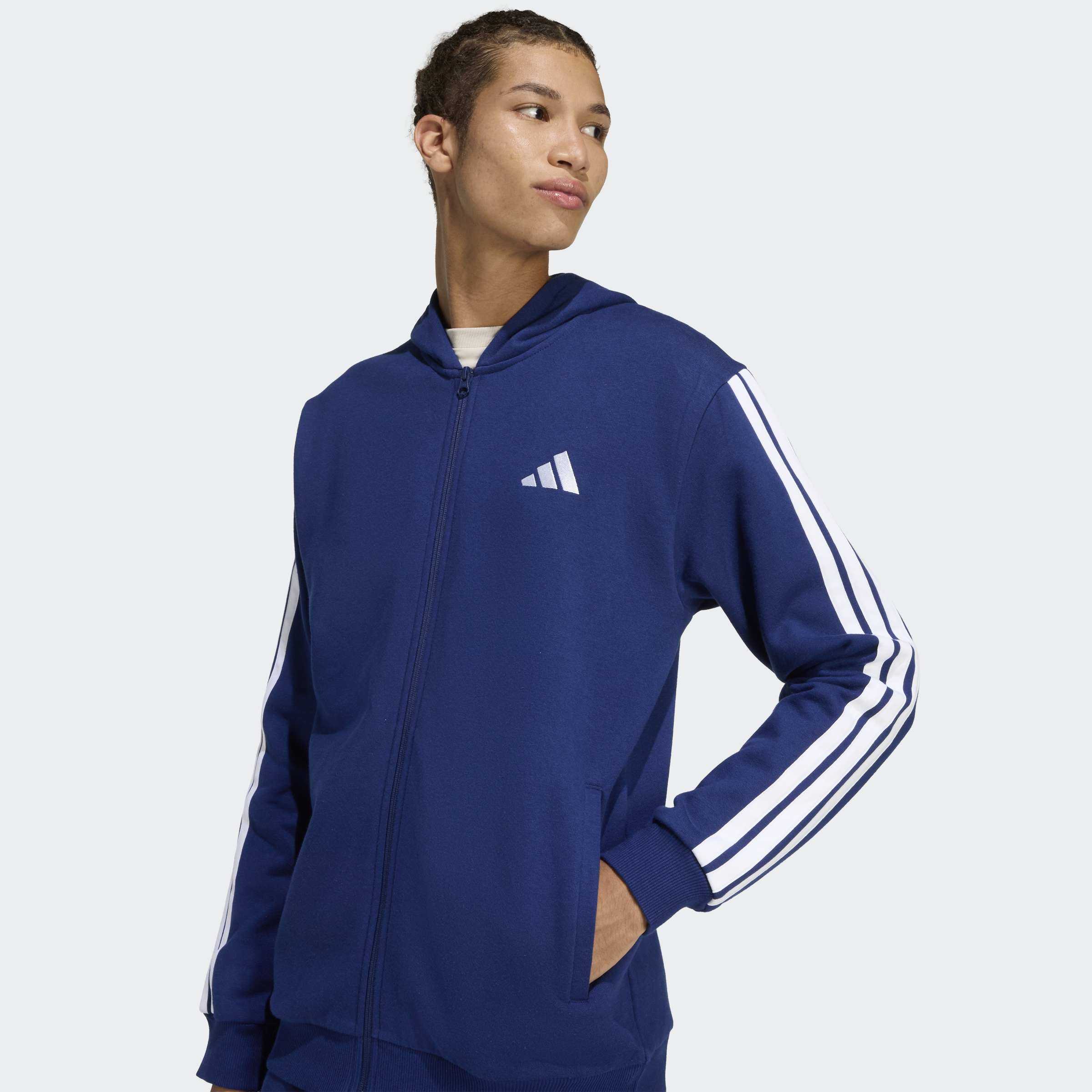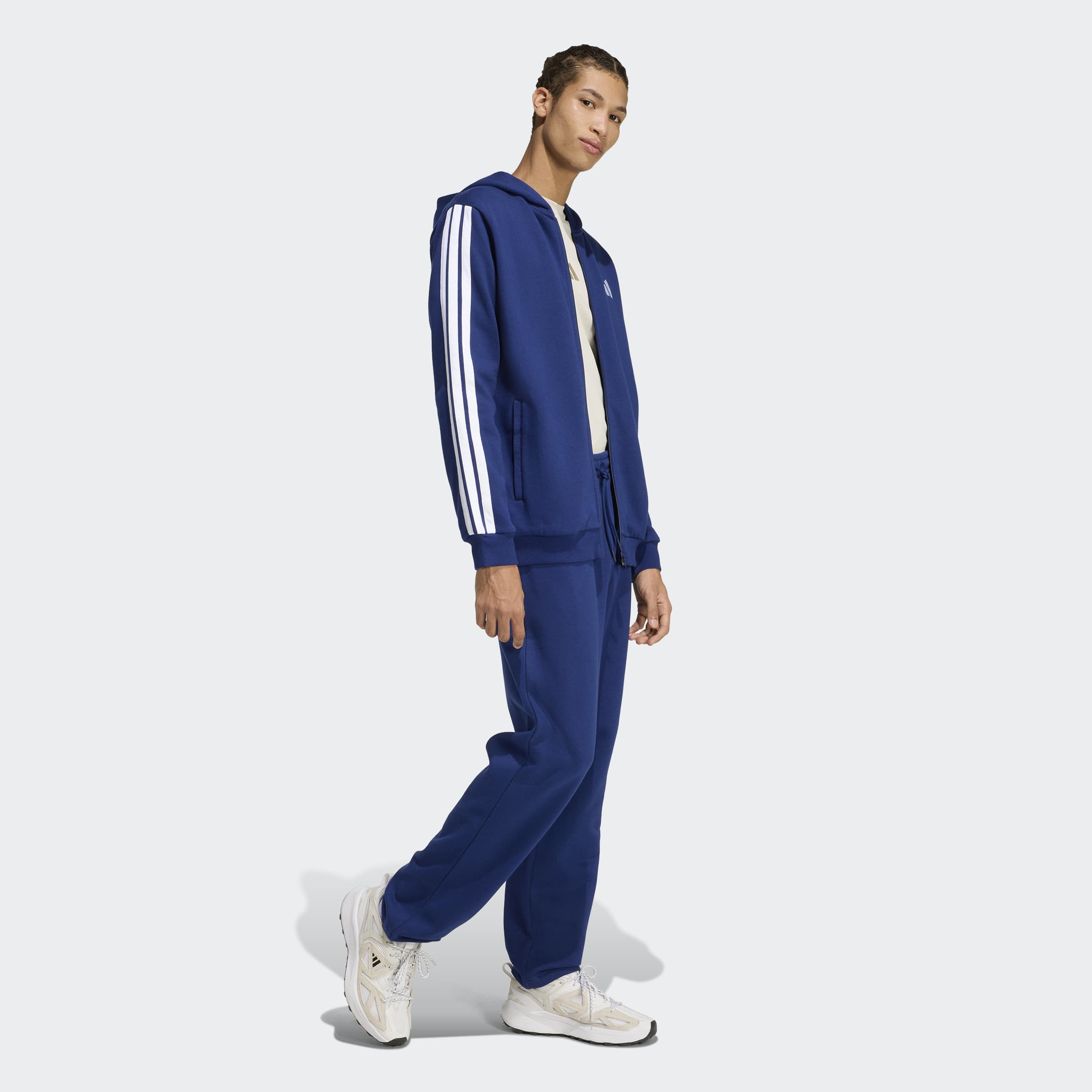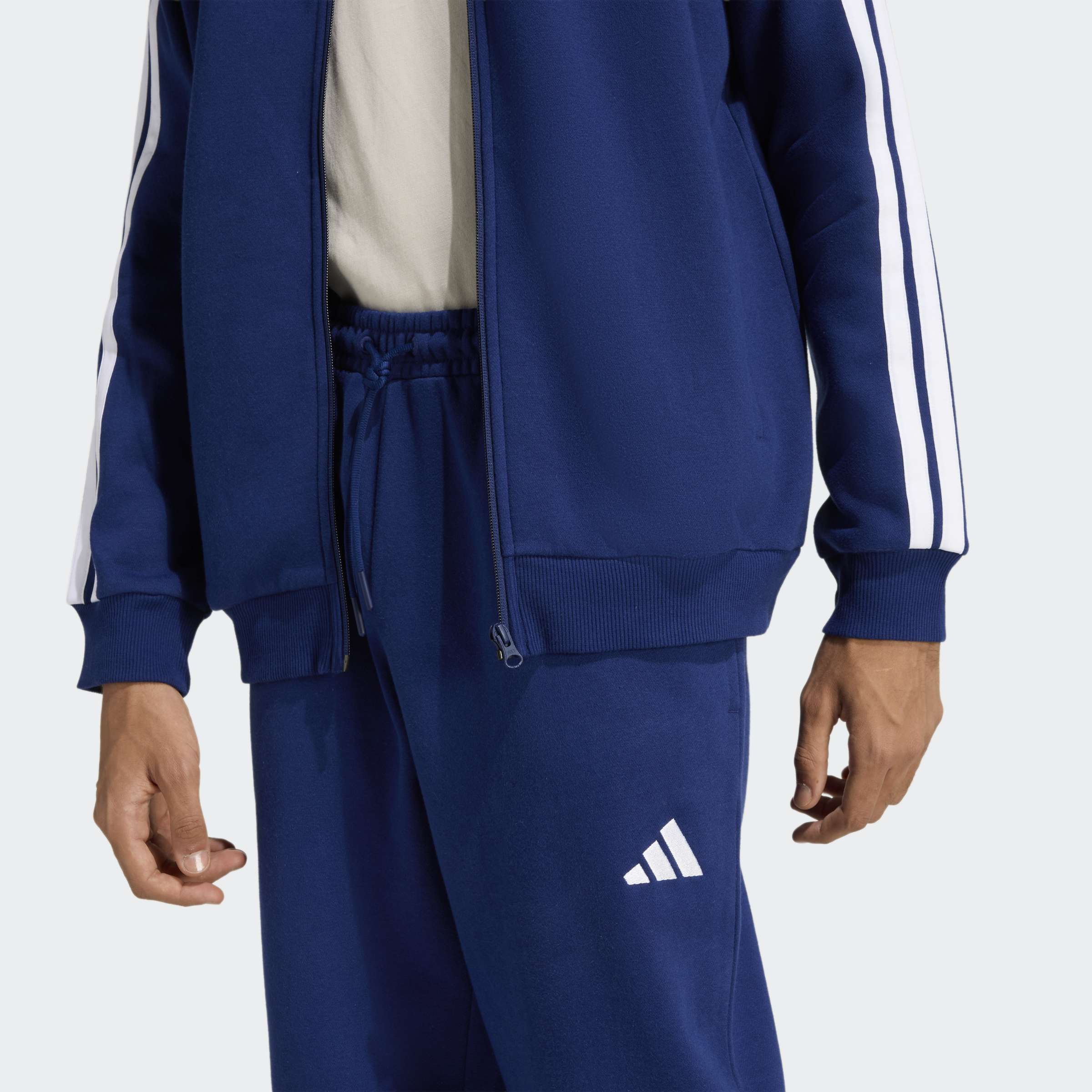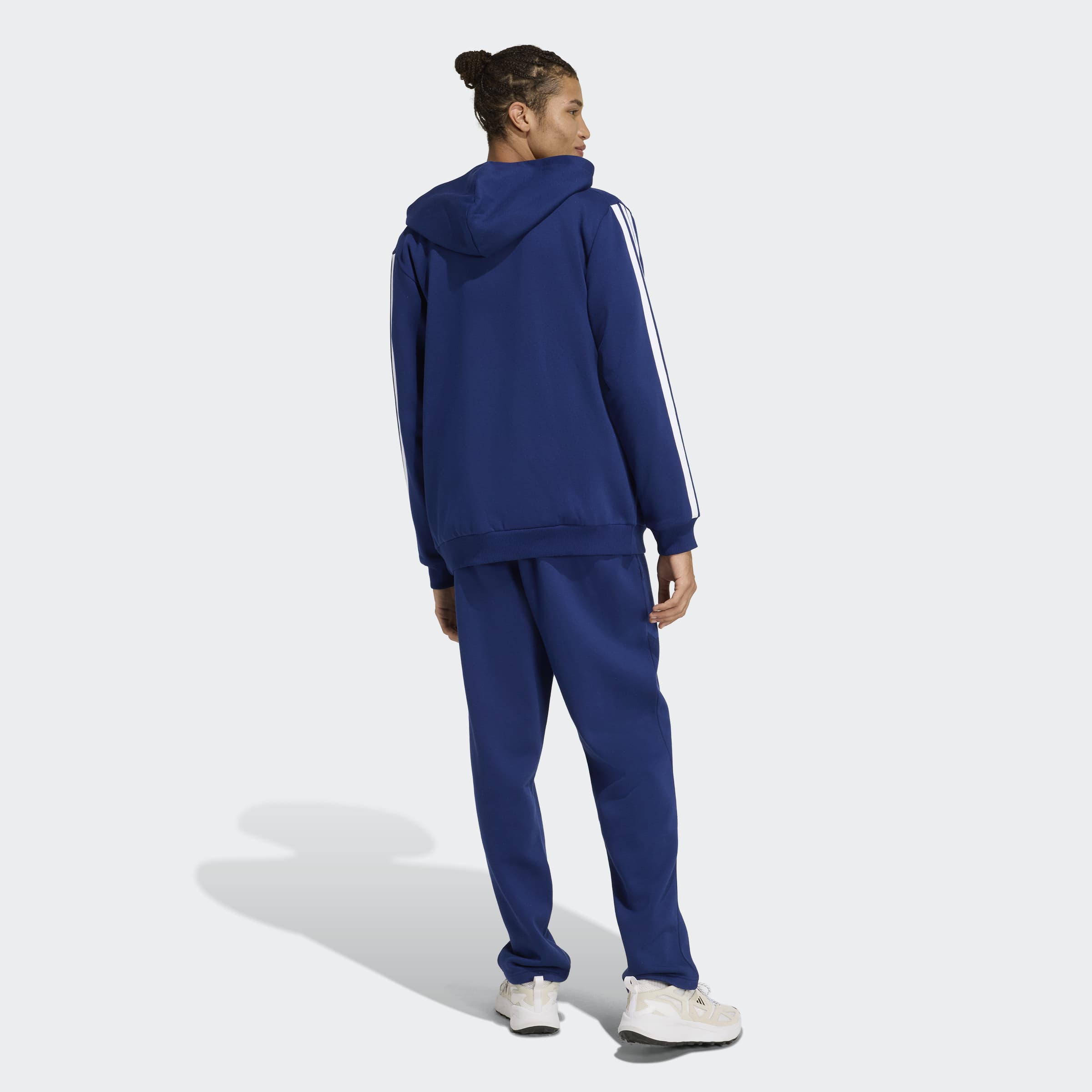Este fato de treino com capuz adidas 3-Stripes Fleece oferece um visual dinâmico que vais querer usar todos os dias. O fato combina calças de bainha aberta com uma cintura média e um casaco com capuz. É tudo uma questão de conforto: é feito com fleece macio que proporciona calor e uma sensação acolhedora. As 3 Riscas nas mangas e os logótipos subtis de roupa desportiva conferem ao fato de treino um aspeto exclusivo.