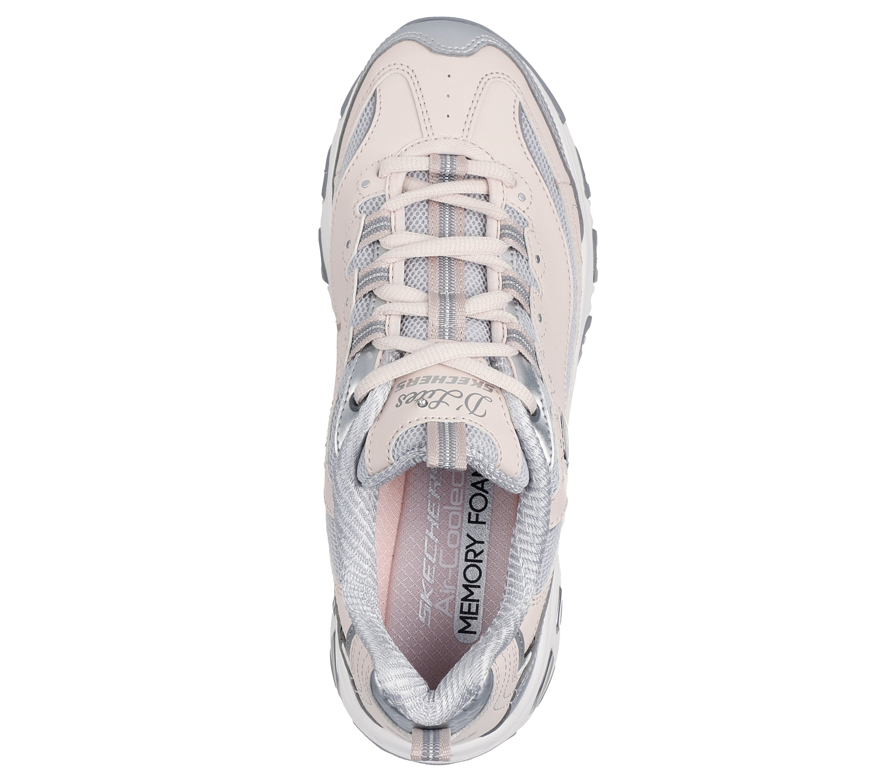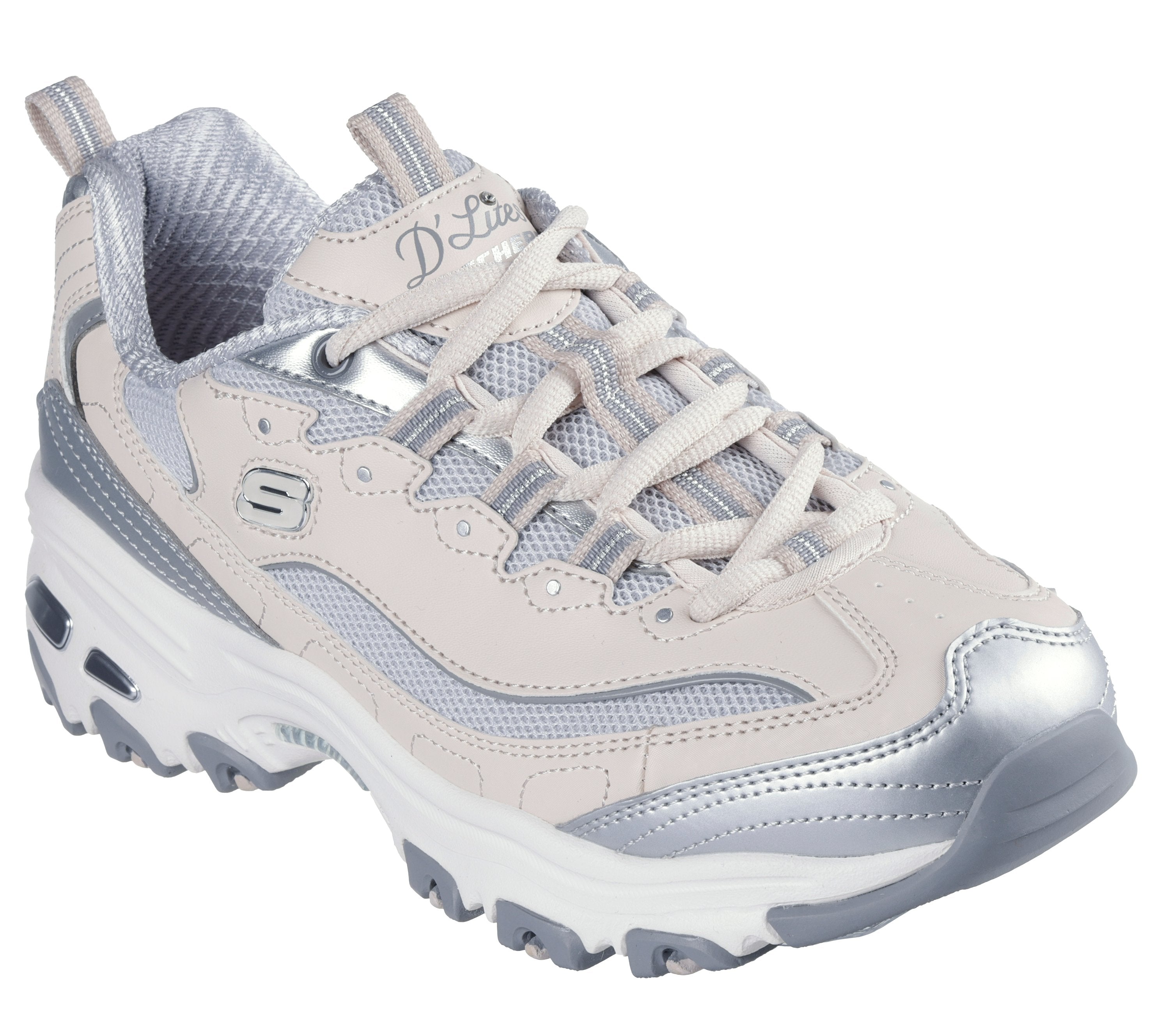 Sai com estilo icônico e conforto usando Skechers D'Lites® - Chromatic. Este estilo casual de cordão apresenta um cabedal de malha com sobreposição de duraleather, detalhes metálicos, uma palmilha Skechers Air-Cooled Memory Foam® acolchoada e uma entressola com absorção de choque.